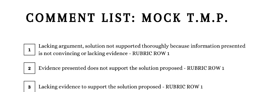 For MOCK versions of the A.P. Seminar performance tasks students respond well to timely, rubric-based feedback. This comment list (numbered 1-14) can be used to note areas of attention for students on their MOCK T.M.P. Simply distribute the list and note the comment number directly on your feedback sheet after students present their work